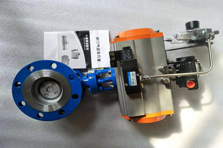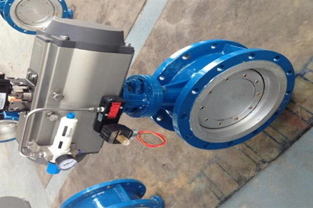 氣動法蘭三偏心蝶閥桿軸線與蝶板密封面間偏置,并與閥體通道軸線偏置,閥座回轉軸線與閥體通道軸線形成一個偏心角,故形成三偏心。蝶閥從0°~90°開啟時,蝶板密封面會在開啟的瞬間立即脫離閥座密封面,在其90°~0°關閉時,蝶板圓錐形密封面才會接觸并壓緊閥座圓錐形密封。所以閥座與蝶板上的密封面之間無任何摩擦,去除了磨損和泄漏的可能性。